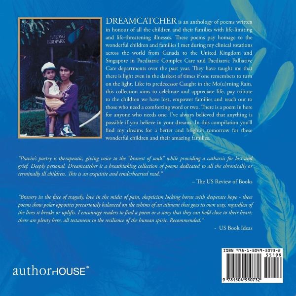 DREAMCATCHER is an anthology of poems written in honour of all the children and their families with life-limiting and life-threatening illnesses. These poems pay homage to the wonderful children and families I met during my clinical rotations across the world from Canada to the United Kingdom and Singapore in Paediatric Complex Care and Paediatric Palliative Care departments over the past year. They have taught me that there is light even in the darkest of times if one remembers to turn on the light. Like its predecessor Caught in the Mo(u)rning Rain, this collection aims to celebrate and appreciate life, pay tribute to the children we have lost, empower families and reach out to those who need a comforting word or two. There is a poem in here for anyone who needs one. I've always believed that anything is possible if you believe in your dreams. In this compilation you'll find my dreams for a better and brighter tomorrow for these wonderful children and their amazing families. "Pravin's poetry is therapeutic, giving voice to the "bravest of souls" while providing a catharsis for loss and grief. Deeply personal, Dreamcatcher is a breathtaking collection of poems dedicated to all the chronically or terminally ill children. This is an exquisite and tenderhearted read." - The US Review of Books "Bravery in the face of tragedy, love in the midst of pain, skepticism locking horns with desperate hope - these poems show polar opposites precariously balanced on the whims of an ailment that goes its own way, regardless of the lives it breaks or uplifts. I encourage readers to find a poem or a story that they can hold close to their heart: there are plenty here, all testament to the resilience of the human spirit. Recommended." - US Book Ideas