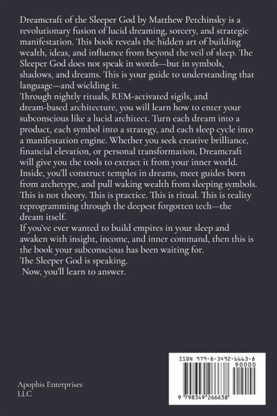 Dreamcraft of the Sleeper God by Matthew Petchinsky is a revolutionary fusion of lucid dreaming, sorcery, and strategic manifestation. This book reveals the hidden art of building wealth, ideas, and influence from beyond the veil of sleep. The Sleeper God does not speak in words-but in symbols, shadows, and dreams. This is your guide to understanding that language-and wielding it. Through nightly rituals, REM-activated sigils, and dream-based architecture, you will learn how to enter your subconscious like a lucid architect. Turn each dream into a product, each symbol into a strategy, and each sleep cycle into a manifestation engine. Whether you seek creative brilliance, financial elevation, or personal transformation, Dreamcraft will give you the tools to extract it from your inner world. Inside, you'll construct temples in dreams, meet guides born from archetype, and pull waking wealth from sleeping symbols. This is not theory. This is practice. This is ritual. This is reality reprogramming through the deepest forgotten tech-the dream itself. If you've ever wanted to build empires in your sleep and awaken with insight, income, and inner command, then this is the book your subconscious has been waiting for. The Sleeper God is speaking. Now, you'll learn to answer.