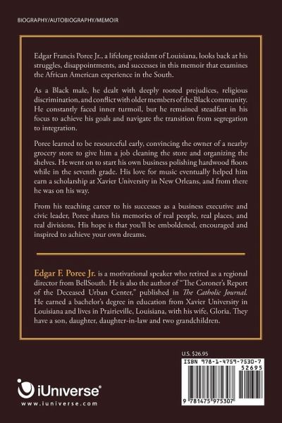 Edgar Frances Poree Jr., a lifelong resident of Louisiana, looks back at his struggles, disappointments, and successes in this memoir that examines the African American experience in the South. As a Black male, he dealt with deeply rooted prejudices, religious discrimination, and conflict with older members of the Black community. He constantly faced inner turmoil, but he remained steadfast in his focus to achieve his goals and navigate the transition from segregation to integration. Poree learned to be resourceful early, convincing the owner of a nearby grocery store to give him a job cleaning the store and organizing the shelves. He went on to start his own business polishing hardwood floors while in the seventh grade. His love for music eventually helped him earn a scholarship at Xavier University in New Orleans, and from there he was on his way. From his teaching career to his successes as a business executive and civic leader, Poree shares his memories of real people, real places, and real divisions. His hope is that you'll be emboldened, encouraged and inspired to achieve your own dreams.