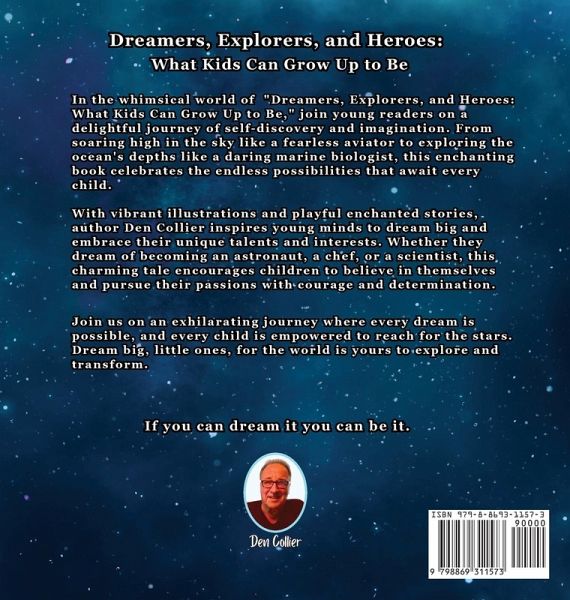 In the whimsical world of "Dreamers, Explorers, and Heroes: What Kids Can Grow Up to Be," join young readers on a delightful journey of self-discovery and imagination. From soaring high in the sky like a fearless aviator to exploring the depths of the ocean like a daring marine biologist, this enchanting book celebrates the endless possibilities that await every child. With vibrant illustrations and playful enchanted stories, author Den Collier inspires young minds to dream big and embrace their unique talents and interests. Whether they dream of becoming an astronaut, a chef, or a scientist, this charming tale encourages children to believe in themselves and pursue their passions with courage and determination. Join us on an exhilarating journey where every dream is a possibility, and every child is empowered to reach for the stars. Dream big, little ones, for the world is yours to explore and transform. If you can dream it you can be it.