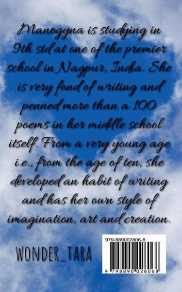 Manogyna is studying in 9th std at one of the premier school in Nagpur, India. She is very fond of writing and penned more than a 100 poems in her middle school itself. From a very young age i.e., from the age of ten, she developed the habit of writing and has her own unique style of imagination, art and creation. This book depicts the life experiences of a young girl with her collection of her beautiful poems.