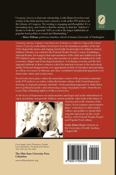 Dreaming America: Popular Front Ideals and Aesthetics in Children's Plays of the Federal Theatre Project by Leslie Elaine Frost traces how the tumultuous politics of the late 1930s shaped the stories and staging of federally funded plays for children. Indeed, children's theater was central to the Federal Theatre Project's vision of building a national theater. Frost argues that representations of the child and childhood in the FTP children's plays stage the hopes and anxieties of a nation destabilized by both economic collapse and technological advances. A declining economy and the first stagnant birthrate in three centuries yoked the national economy to the individual family. Profound disagreements over appropriate models of education and parenting, as well as over issues of ethnicity and class, constituted fundamental arguments over democratic values and social norms. Frost locates these plays within the immediate context of the production materials in the FTP archives, as well as within the broader culture of the Great Depression, drawing on disparate primary materials-from parenting magazines to strike literature to political journals-and referencing a range of popular events-from the Joe Louis/Max Schmeling fights to Hollywood movies. As the focus of Depression-era adult anxieties and hopes and as the embodiment of vigor, dynamism, and growth, children carried symbolic value both as the future of America and as the America of the future. Frost examines representative plays' connections to other media, culture, and politics to situate their singular trajectories in the social history of the Federal Theatre Project and Popular Front culture.