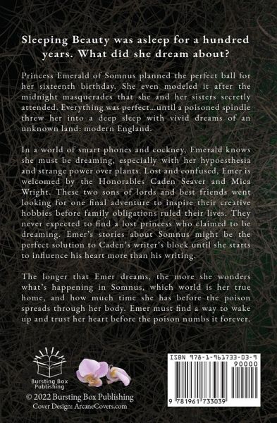 Sleeping Beauty was asleep for a hundred years. What did she dream about? Princess Emerald of Somnus planned the perfect ball for her sixteenth birthday. She even modeled it after the midnight masquerades that she and her sisters secretly attended. Everything was perfect...until a poisoned spindle threw her into a deep sleep with vivid dreams of an unknown land: modern England. In a world of smart phones and cockney, Emerald knows she must be dreaming, especially with her hypoesthesia and strange power over plants. Lost and confused, Emer is welcomed by the Honorables Caden Seaver and Mica Wright. These two sons of lords and best friends went looking for one final adventure to inspire their creative hobbies before family obligations ruled their lives. They never expected to find a lost princess who claimed to be dreaming. Emer's stories about Somnus might be the perfect solution to Caden's writer's block until she starts to influence his heart more than his writing. The longer that Emer dreams, the more she wonders what's happening in Somnus, which world is her true home, and how much time she has before the poison spreads through her body. Emer must find a way to wake up and trust her heart before the poison numbs it forever. Explore the beauties and wonders of today's England in this fairy tale retelling of Charles Perrault's Sleeping Beauty. Fans of Disney's "Enchanted" (2007) and twisted fairy tales may consider this story a dream come true.
