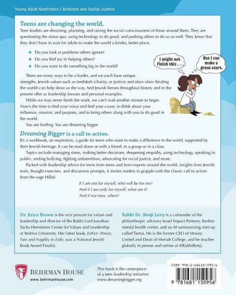 A thought book and actionable guide for Jewish teens who want to make a difference in the world. Teens are changing the world. Teen leaders are dreaming, planning, and raising the social consciousness of those around them. They are questioning the status quo, using technology to do good, and pushing others to do so as well. They know that they don't have to wait for adults to make the world a kinder, better place. * Do you look at problems others ignore? * Do you find joy in helping others? * Do you want to do something big in the world? There are many ways to be a leader, and we each have unique strengths. Jewish values such as tzedakah (charity, or justice), and tikun olam (healing the world) can help show us the way. And Jewish heroes throughout history and in the present offer us leadership lessons and personal examples. While we may never finish the work, we can't wait another minute to begin. Now's the time to find your voice and your cause, to think about your influence, mission, courage, and purpose, and to bring others along with you to do good in the world. You are leading. You are dreaming bigger. Dreaming Bigger is a call to action. It's a workbook, an inspiration, a guide for teens who want to make a difference in the world, supported by their Jewish heritage. It can be read alone or with a friend, in a group, or in a class. Topics include managing stress, making better decisions, deepening empathy, using technology, speaking in public, ending bullying, fighting antisemitism, advocating for racial justice, and more. Packed with leadership advice for teens from teens and from experts around the world, insights from Jewish texts, thought exercises, and discussion prompts, it invites readers to grapple with the classic call to action from the sage Hillel: If I am not for myself, who will be for me? And if I am only for myself, what am I? And if not now, when?