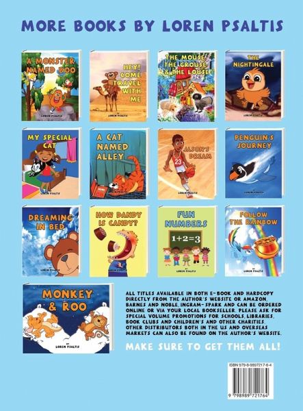 Loren Psaltis was born in 1966 and raised in Johannesburg, South Africa. She moved to the US in2006.A voracious reader with an inquisitive mind, Lori was always questioning and learning. Known inher community and beyond for her strength, positivity, kindness and humor, she touched, helped andinfluenced countless people with her selfless, charitable approach to living. From the young to theold, her infectious charisma and compassion drew in people from all walks of life and backgrounds.Overcoming a difficult upbringing, personal tragedy and trying circumstances, Lori sought to makethe world a better place, bringing her mes- sage of love and generosity to all she met. Herprofessional success in business, extensive travel and extraordinary life experience, coupled with hertireless dedication, helped Lori serve as a bright light to the world, bringing hope and resources tounderprivileged children, animal protection and many other worthy causes.Lori channeled her experiences into writing her first book The Devolution of Man, as well asthirteen children's books which she wrote, illustrated and edited herself. Through these books, shehoped and dreamed of spreading a positive message to a wider audience of children and adults.Loren's tragic and untimely passing in 2021 left a huge void in the countless lives and memories ofall those she touched, including her husband and best friend of thirty-six years.