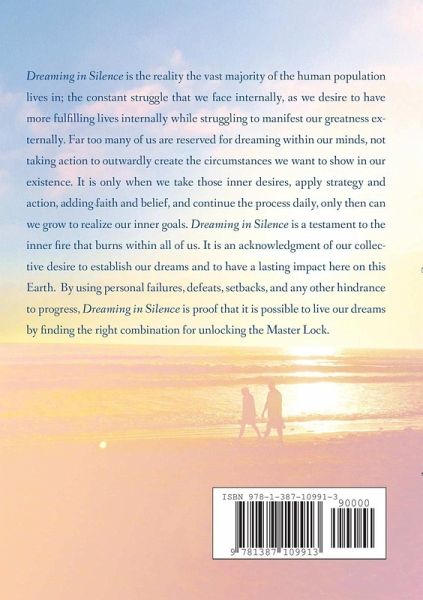 Dreaming in Silence is the reality the vast majority of the human population lives in; the constant struggle that we face internally, as we desire to have more within the confines of our minds while we struggle to manifest that which we want outwardly. Far too many of us are reserved for dreaming within our minds, not taking action to outwardly create the circumstances we want to show in our existence. It is only when we take those inner desires, apply strategy and action, adding faith and belief, and continue the process daily, only then can we grow to realize our inner goals. Dreaming in Silence is a testament to the inner fire that burns within all of us, it is an acknowledgment of our collective desire to establish our dreams. By using personal failures, defeats, setbacks, and any other hindrance to progress, Dreaming in Silence is proof that it is possible to live our dreams by finding the right combination for unlocking the Master Lock.