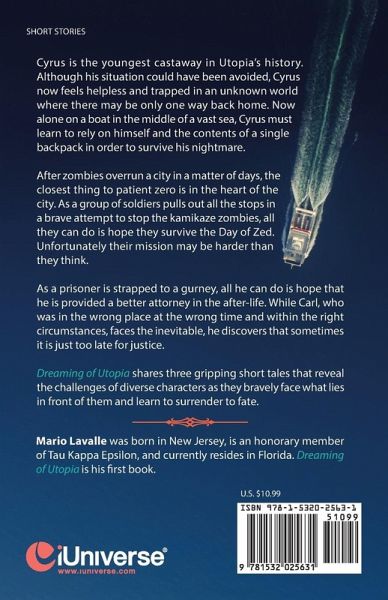 Cyrus is the youngest castaway in Utopia’s history. Although his situation could have been avoided, Cyrus now feels helpless and trapped in an unknown world where there may be only one way back home. Now alone on a boat in the middle of a vast sea, Cyrus must learn to rely on himself and the contents of a single backpack in order to survive his nightmare. After zombies overrun a city in a matter of days, the closest thing to patient zero is in the heart of the city. As a group of soldiers pulls out all the stops in a brave attempt to stop the kamikaze zombies, all they can do is hope they survive the Day of Zed. Unfortunately their mission may be harder than they think. As a prisoner is strapped to a gurney, all he can do is hope that he is provided a better attorney in the after-life. While Carl, who was in the wrong place at the wrong time and within the right circumstances, faces the inevitable, he discovers that sometimes it is just too late for justice. Dreaming of Utopia shares three gripping short tales that reveal the challenges of diverse characters as they bravely face what lies in front of them and learn to surrender to fate.
