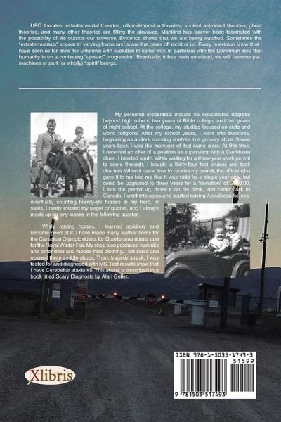 My personal credentials include no educational degrees lesser than high school, two years of Bible college, and two years of night school. At the college, my studies focused on cults and world religions. After my school years, I went into business, beginning as a clerk stocking shelves in a grocery store. Seven years later, I was the manager of that same store. At this time, I received an offer of a position as supervisor with a Caribbean chain. I headed south. While waiting for a three-year work permit to come through, I bought a thirty-four-foot cruiser and took charters. When it came time to receive my permit, the officer who gave it to me told me that it was valid for a single year only, but it could be upgraded to three years for a "donation" of $500. I tore the permit up, threw it on his desk, and came back to Canada. I went into sales and started raising Appaloosa horses, eventually counting twenty-six horses in my herd. In sales, I rarely missed my target or quotas, and I always made up for any losses in the following quarter. While raising horses, I learned saddlery and became good at it. I have made many leather items for the Canadian Olympic riders, for Quarterama riders, and for the Royal Winter Fair. My shop also produced mukluks and other deer and moose-hide clothing. I left sales and opened three saddle shops. Then tragedy struck; I was tested for and diagnosed with MS. Test results show that I have cerebellar ataxia type 5. This ataxia is described in a book titled Scary Diagnosis by Alan Geller.