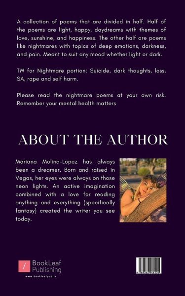 ""A collection of poems that are divided in half. Half of the poems are light, happy, daydreams with themes of love, sunshine, and happiness. The other half are poems like nightmares with topics of deep emotions, darkness, and pain. Meant to suit any mood whether light or dark. TW for Nightmare portion: Suicide, dark thoughts, loss, SA, rape and self harm. Please read the nightmare poems at your own risk. Remember your mental health matters""