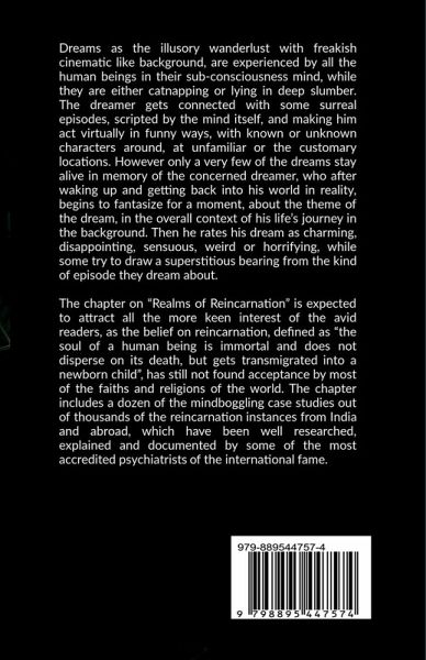 Dreams as the illusory wanderlust with freakish cinematic like background, are experienced by all the human beings in their sub-consciousness mind, while they are either catnapping or lying in deep slumber. The dreamer gets connected with some surreal episodes, encrypted by the mind itself, and making him act virtually in funny ways, with known or unknown characters around, at unfamiliar or the customary locations. However only a very few of the dreams stay alive in memory of the concerned dreamer, who after waking up and getting back into his world in reality, begins to fantasize for a moment, about the theme of the dream, in the overall context of his life in the background, to rate his dream as charming, disappointing, sensuous, weird or horrifying. Some people try to draw a superstitious bearing from theme of the episode they dream about. The chapter i.e. "Realms of Reincarnation" is expected to attract all the more keen interest of the avid readers, as the belief on reincarnation i.e. the soul of a human being is immortal and does not disperse on its death, but gets transmigrated into a newborn child, has still not found acceptance by most of the faiths and religions of the world. The chapter includes a dozen of the mindboggling case studies out of thousands of the reincarnation instances from India and abroad, which have been well researched, elucidated and documented by some of the most accredited psychiatrists of the international fame.