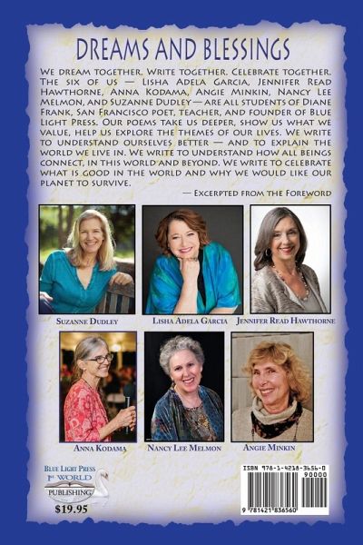 Six Visionary Poets: Lisha Adela Garcia Jennifer Read Hawthorne Anna Kodama Nancy Lee Melmon Angie Minkin Suzanne Dudley Edited by Diane Frank Foreword by Jennifer Read Hawthorne #1 New York Times bestselling coauthor, Chicken Soup for the Woman’s Soul We dream together. Write together. Celebrate together. The six of us — Lisha Adela Garcia, Jennifer Read Hawthorne, Anna Kodama, Angie Minkin, Nancy Lee Melmon, and Suzanne Dudley — are all students of Diane Frank, San Francisco poet, teacher, and founder of Blue Light Press. Our poems take us deeper, show us what we value, help us explore the themes of our lives. We write to understand ourselves better — and to explain the world we live in. We write to understand how all beings connect, in this world and beyond. We write to celebrate what is good in the world and why we would like our planet to survive. — Excerpted from the Foreword