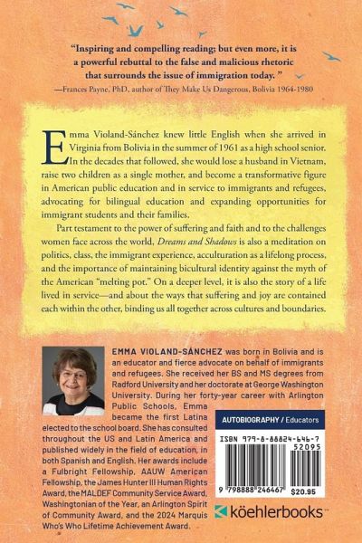 Emma Violand-Sánchez knew little English when she arrived in Virginia from Bolivia in the summer of 1961 as a high school senior. In the decades that followed, she would lose a husband in Vietnam, raise two children as a single mother, and become a transformative figure in American public education and in service to immigrants and refugees, advocating for bilingual education and expanding opportunities for immigrant students and their families.Part testament to the power of suffering and faith and to the challenges women face across the world, Dreams and Shadows is also a meditation on politics, class, the immigrant experience, acculturation as a lifelong process, and the importance of maintaining bicultural identity against the myth of the American "melting pot." On a deeper level, it is also the story of a life lived in service-and about the ways that suffering and joy are contained each within the other, binding us all together across cultures and boundaries.