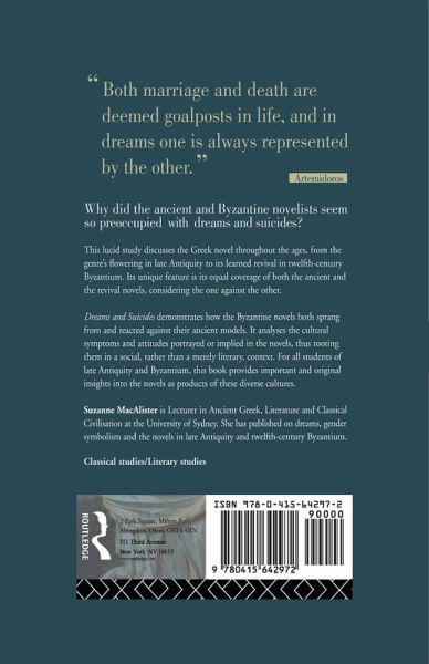 This study discusses the Greek novel through the ages, from the genre's flowering in late Antiquity to its learned revival in twelfth-century Byzantium. Its unique feature is its full coverage of the Byzantine novels, demonstrating that they both depend upon and react against the ancient novel, and can only be understood against the cultural backdrop of ancient Greek literature. Dreams and Suicides analyses the cultural symptoms and attitudes portrayed or implied in the novels, thus rooting them in a social rather than merely a literary context. For all students of ancient culture, this book provides important and original insights into the genre of ancient literature.