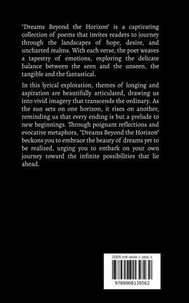 "Dreams Beyond the Horizon" is a captivating collection of poems that invites readers to journey through the landscapes of hope, desire, and uncharted realms. With each verse, the poet weaves a tapestry of emotions, exploring the delicate balance between the seen and the unseen, the tangible and the fantastical. In this lyrical exploration, themes of longing and aspiration are beautifully articulated, drawing us into vivid imagery that transcends the ordinary. As the sun sets on one horizon, it rises on another, reminding us that every ending is but a prelude to new beginnings. Through poignant reflections and evocative metaphors, "Dreams Beyond the Horizon" beckons you to embrace the beauty of dreams yet to be realized, urging you to embark on your own journey toward the infinite possibilities that lie ahead.