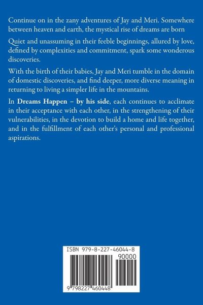 Continue on in the zany adventures of Jay and Meri. Somewhere between heaven and earth, the mystical rise of dreams are born Quiet and unassuming in their feeble beginnings, allured by love, defined by complexities and commitment, spark some wonderous discoveries. With the birth of their babies, Jay and Meri tumble in the domain of domestic discoveries, and find deeper, more diverse meaning in returning to living a simpler life in the mountains. In Dreams Happen - by his side, each continues to acclimate in their acceptance with each other, in the strengthening of their vulnerabilities, in the devotion to build a home and life together, and in the fulfillment of each other's personal and professional aspirations.