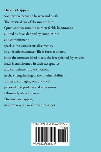 Dreams Happen Somewhere between heaven and earth The mystical rise of dreams are born Quiet and unassuming in their feeble beginnings, allured by love, defined by complexities and commitment, spark some wonderous discoveries. In an ironic encounter, life is forever altered from the moment Meri meets the free spirited Jay Stryde. Each is transformed in their acceptance and commitment to each other, in the strengthening of their vulnerabilities, and in encouraging one another's personal and professional aspirations. Ultimately Meri learns - Dreams can happen, in more ways than she ever imagines.
