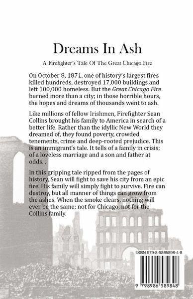 Dreams in Ash is a Historical Fiction novel centered on the Great Chicago Fire of 1871, as seen through the eyes of a Chicago firefighter and his family. The novel explores the socioeconomic challenges facing Irish Immigrants in 1871, with a special focus on xenophobia and misogyny before, during, and after the fire. The long- hot summer and fall of 1871 has left Chicago a tinderbox; both literally and figuratively. Like millions of fellow Irishmen, Firefighter Shawn Collins brought his family to America in search of a better life. Rather than the idyllic New World they dreamed of, they found poverty, crowded tenements, crime, and deep-rooted prejudice. Fighting to hold his family together, Sean desperately tries to reason with Maggie, his disenchanted wife, who dreams of nothing but escaping the city. Poverty has made his son (Liam) cynical of everything his father believes in, and the lure of easy money is drawing him under the spell of a ruthless mob boss. Sean's only source of happiness is a young widow and her daughters, a love he cannot have but finds ever harder to resist. All comes to a crisis with the first spark of the Great Chicago Fire. More than a city will burn on October 8, 1871; the hopes and dreams of thousands will go to ash. A mix of raw human drama and an epic thriller, this work of historical fiction dramatically explores the struggles of 19th-century Irish immigrants, as they try to survive one of history's most destructive fires.