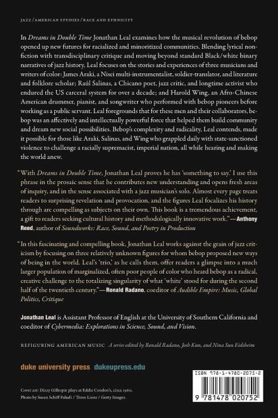 In Dreams in Double Time Jonathan Leal examines how the musical revolution of bebop opened up new futures for racialized and minoritized communities. Blending lyrical nonfiction with transdisciplinary critique and moving beyond standard Black/white binary narratives of jazz history, Leal focuses on the stories and experiences of three musicians and writers of color: James Araki, a Nisei multi-instrumentalist, soldier-translator, and literature and folklore scholar; Raúl Salinas, a Chicano poet, jazz critic, and longtime activist who endured the US carceral system for over a decade; and Harold Wing, an Afro-Chinese American drummer, pianist, and songwriter who performed with bebop pioneers before working as a public servant. Leal foregrounds that for these men and their collaborators, bebop was an affectively and intellectually powerful force that helped them build community and dream new social possibilities. Bebop's complexity and radicality, Leal contends, made it possible for those like Araki, Salinas, and Wing who grappled daily with state-sanctioned violence to challenge a racially supremacist, imperial nation, all while hearing and making the world anew.