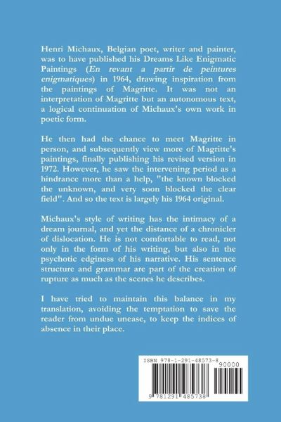 Henri Michaux, Belgian poet, writer and painter, finally published his Dreams Like Enigmatic Paintings (En revant a partir de peintures eigmatiques) in 1972. The text is a series of dreamscapes which came to him having seen a few of Magritte's paintings. It is not an interpretation of Magritte, but a logical continuation of Michaux's own work in poetic form. Michaux's style of writing has the intimacy of a dream journal, and yet the distance of a chronicler of dislocation. He is not comfortable to read, not only in the form of his writing, but also in the psychotic edginess of his narrative. I have tried to maintain this balance in my translation, avoiding the temptation to save the reader from undue ease. Michael Eales has an MA in Literary Translation