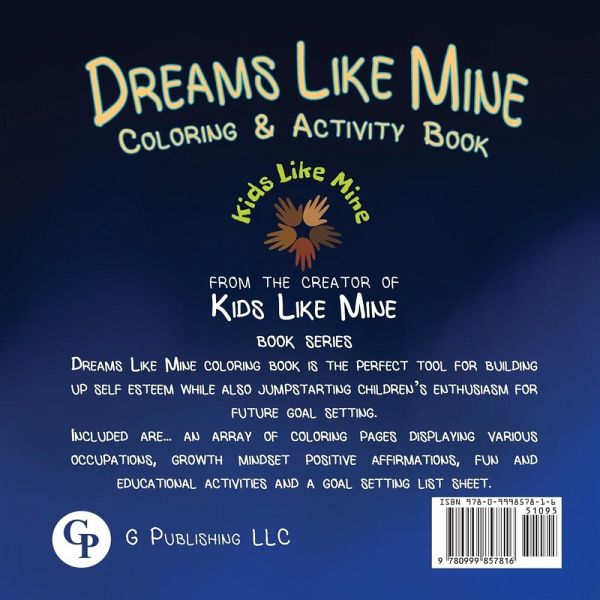 From the creators of The Kids Like Mine Book Series Dreams Like Mine coloring book is the perfect tool for building up self esteem while also jumpstarting children's enthusiasm for future goal setting. Included are... an array of coloring pages displaying various occupations, growth mindset positive affirmations, fun and educational activities and a goal setting list sheet.