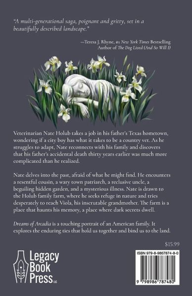 Veterinarian Nate Holub takes a job in his father's Texas hometown, wondering if a city boy has what it takes to be a country vet. As he struggles to adapt, Nate reconnects with his family and discovers that his father's accidental death thirty years earlier was much more complicated than he realized. Nate delves into the past, afraid of what he might find. He encounters a resentful cousin, a wary town patriarch, a reclusive uncle, a beguiling hidden garden, and a mysterious illness. Nate is drawn to the Holub family farm, where he seeks refuge in nature and tries desperately to reach Viola, his inscrutable grandmother. The farm is a place that haunts his memory, a place where dark secrets dwell. Dreams of Arcadia is a touching portrait of an American family. It explores the enduring ties that hold us together and bind us to the land.