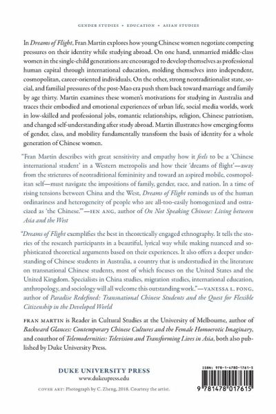 In Dreams of Flight, Fran Martin explores how young Chinese women negotiate competing pressures on their identity while studying abroad. On one hand, unmarried middle-class women in the single-child generations are encouraged to develop themselves as professional human capital through international education, molding themselves into independent, cosmopolitan, career-oriented individuals. On the other, strong neotraditionalist state, social, and familial pressures of the post-Mao era push them back toward marriage and family by age thirty. Martin examines these women's motivations for studying in Australia and traces their embodied and emotional experiences of urban life, social media worlds, work in low-skilled and professional jobs, romantic relationships, religion, Chinese patriotism, and changed self-understanding after study abroad. Martin illustrates how emerging forms of gender, class, and mobility fundamentally transform the basis of identity for a whole generation of Chinese women.