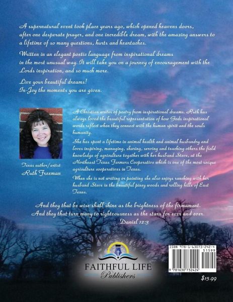 A supernatural event took place years ago, which opened heavens doors, after one desperate prayer, and one incredible dream, with the amazing answers to a lifetime of so many questions, hurts and heartaches. Written in an elegant poetic language from inspirational dreams in the most unusual way. It will take you on a journey of encouragement with the Lords inspiration, and so much more. Live your beautiful dreams! In-Joy the moments you are given.