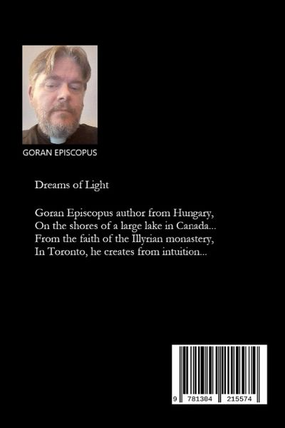 Dreams of Light Goran Episcopus author from Hungary, On the shores of a large lake in Canada... From the faith of the Illyrian monastery, In Toronto, he creates from intuition... Goran writes by candle's glow, In a quiet room he dreams... Words from history flow, Infinite like streams... Drawing wisdom from the past, Pages turning hand by hand... His art and tales so vast, In a distant land... Dreams of light in words unfold, Stories ancient yet so bold... Echoes time cannot erase, In his thoughts we find our place...