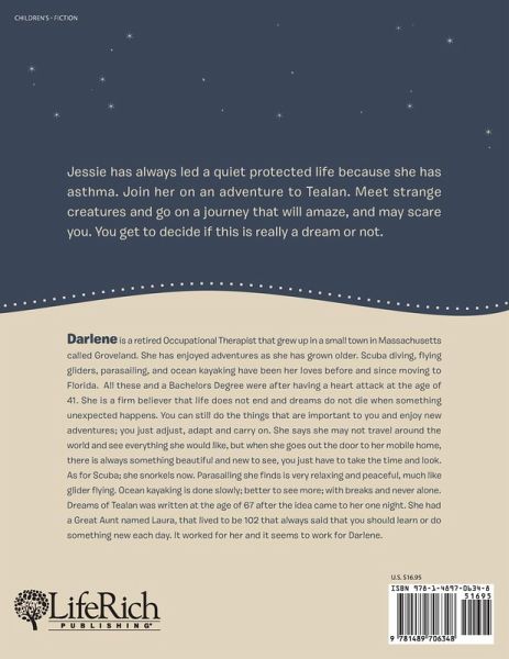 Jessie has always led a quiet protected life because she has asthma. Join her on an adventure to Tealan. Meet strange creatures and go on a journey that will amaze, and may scare you. You get to decide if this is really a dream or not.