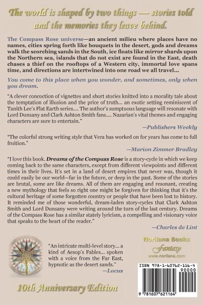 This is the 10th Anniversary Edition of the critically acclaimed mythic fantasy classic "collage novel" DREAMS OF THE COMPASS ROSE by two-time Nebula Award Nominee Vera Nazarian. The world is shaped by two things -- stories told and the memories they leave behind. The Compass Rose universe -- an ancient milieu where places have no names, cities spring forth like bouquets in the desert, gods and dreams walk the scorching sands in the South, ice floats like mirror shards upon the Northern sea, islands that do not exist are found in the East, death chases a thief on the rooftops of a Western city, immortal love spans time, and directions are intertwined into one road we all travel.... You come to this place when you wonder, and sometimes, only when you dream. What is the nature of evil? When a young warrior of a dark race finds himself bound in servitude to a beautiful cruel princess, his loyalty becomes entwined with something more horrifying and mysterious than endless night falling over the ancient desert. When a courageous young servant reveals her hidden wisdom to the madman conqueror of the world, her fate is joined to a nightmare suspended beyond death and outside the universe. Two souls from different times -- their destinies connected through hundreds of other lives and generations, through soft whispers of the wind, through ancient truths that lie buried in an island between worlds. Both souls enslaved through dream and desire in an endless conflict between truth and illusion. They can only be set free by the wonder of the Compass Rose. "A clever concoction of vignettes and short stories knitted into a morality tale about the temptation of illusion and the price of truth... an exotic setting reminiscent of Tanith Lee's Flat Earth series.... The author's sumptuous language will resonate with Lord Dunsany and Clark Ashton Smith fans... Nazarian's vital themes and engaging characters are sure to entertain." -Publishers Weekly "The colorful strong writing style that Vera has worked on for years has come to full fruition." -Marion Zimmer Bradley "I love this book. Dreams of the Compass Rose is a story-cycle in which we keep coming back to the same characters, except from different viewpoints and different times in their lives. It's set in a land of desert empires that never was, though it could easily be our world-far in the future, or deep in the past. Some of the stories are brutal, some are like dreams. All of them are engaging and resonant, creating a new mythology that feels so right one might be forgiven for thinking that it's the cultural heritage of some forgotten country or people that have been lost to history. It reminded me of those wonderful, dream-laden story-cycles that Clark Ashton Smith and Lord Dunsany were writing around the turn of the last century. Dreams of the Compass Rose has a similar stately lyricism, a compelling and visionary voice that speaks to the heart of the reader." -Charles de Lint "Nazarian's story cycle treads the borderline between the episodic novel and the short-story collection... her imagery is rich, vivid, and memorable, not to mention being remarkable because she realizes it not in her native language, Russian, but in English.... this is a singularly appealing book by a new voice in fantasy." -ALA Booklist "An intricate multi-level story... a kind of Aesop's Fables... spoken with a voice from the Far East, hypnotic as the desert sands." -Locus