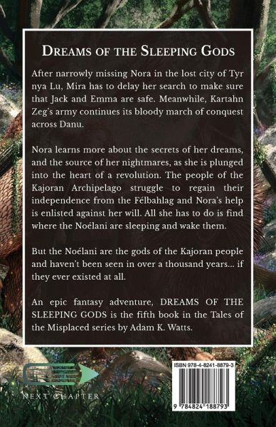 After narrowly missing Nora in the lost city of Tyr nya Lu, Mira has to delay her search to make sure that Jack and Emma are safe. Meanwhile, Kartahn Zeg's army continues its bloody march of conquest across Danu. Nora learns more about the secrets of her dreams, and the source of her nightmares, as she is plunged into the heart of a revolution. The people of the Kajoran Archipelago struggle to regain their independence from the Félbahlag and Nora's help is enlisted against her will. All she has to do is find where the Noélani are sleeping and wake them. But the Noélani are the gods of the Kajoran people and haven't been seen in over a thousand years... if they ever existed at all. An epic fantasy adventure, DREAMS OF THE SLEEPING GODS is the fifth book in the Tales of the Misplaced series by Adam K. Watts.
