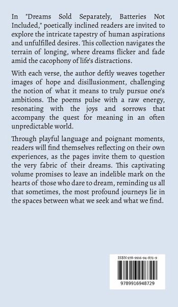 In "Dreams Sold Separately, Batteries Not Included," poetically inclined readers are invited to explore the intricate tapestry of human aspirations and unfulfilled desires. This collection navigates the terrain of longing, where dreams flicker and fade amid the cacophony of life's distractions. With each verse, the author deftly weaves together images of hope and disillusionment, challenging the notion of what it means to truly pursue one's ambitions. The poems pulse with a raw energy, resonating with the joys and sorrows that accompany the quest for meaning in an often unpredictable world. Through playful language and poignant moments, readers will find themselves reflecting on their own experiences, as the pages invite them to question the very fabric of their dreams. This captivating volume promises to leave an indelible mark on the hearts of those who dare to dream, reminding us all that sometimes, the most profound journeys lie in the spaces between what we seek and what we find.