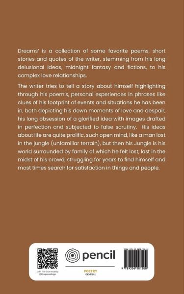 Dreams' is a collection of some favorite poems, short stories and quotes of the writer, stemming from his long delusional ideas, midnight fantasy and fictions, to his complex love relationships. The writer tries to tell a story about himself highlighting through his poem's, personal experiences in phrases like clues of his footprint of events and situations he has been in, both depicting his down moments of love and despair, his long obsession of a glorified idea with images drafted in perfection and subjected to false scrutiny. His ideas about life are quite prolific, such open mind, like a man lost in the jungle (unfamiliar terrain), but then his Jungle is his world surrounded by family of which he felt lost, lost in the midst of his crowd, struggling for years to find himself and most times search for satisfaction in things and people.