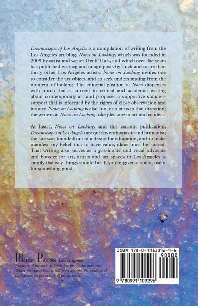 Dreamscapes of Los Angeles is a compilation of writing from the Los Angeles art blog, Notes on Looking, which was founded in 2009 by artist and writer Geoff Tuck, and which over the years has published writing and image posts by Tuck and more than thirty other Los Angeles artists. Notes on Looking invites one to consider the art object, and to seek understanding from the moment of looking. The editorial position at Notes dispenses with much that is current in critical and academic writing about contemporary art and proposes a supportive stance - support that is informed by the rigors of close observation and inquiry. Notes on Looking is also fun, or it aims in that direction; the writers at Notes on Looking take pleasure in art and in ideas. At heart, Notes on Looking, and this current publication, Dreamscapes of Los Angeles are quirky, enthusiastic and humanist; the site was founded out of a desire for education, and to make manifest my belief that to have value, ideas must be shared. That writing also serves as a passionate and vocal advocate and booster for art, artists and art spaces in Los Angeles is simply the way things should be. If you're given a voice, use it for something good.