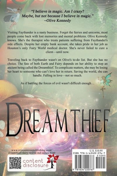 Visiting Faythander, a fairy world, is a nasty business. Forget the fairies and unicorns, most people come back with lost memories and mental problems. Olive Kennedy knows. She's the therapist who treats patients suffering from Faythander's side effects. She may have an emotionless mother and an apathetic boyfriend, but she takes pride in her job. She's never failed to cure a client-until now. Traveling back to Faythander wasn't on Olive's to-do list. But she has no choice. The fate of both Earth and Fairy depends on her ability to stop an evil being called the Dreamthief. Saving the world, she can handle. Falling in love-not so much. Now, she'll have to decide between her heart and the future of an entire planet. As if battling the forces of evil wasn't complicated enough! Dreamthief begins an exciting new fantasy series from Crimson Tree Publishing.
