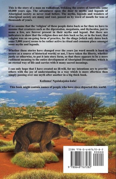 This is the story of a man on walkabout, trekking the centre of Australia some 60,000 years ago. The adventures open the door to myths and legends of Aboriginal society as never read before. The myths, legends and wonders of Aboriginal society are many and vast, passed on by word of mouth for tens of thousands of years. If we assume that the 'religion' of these people dates back so far then we have to assume that creatures such as the diprotodon, megalania, and thylacoleo, just to name a few, are forever present in their myths and legend. But there are indicators to show that the religion does not date back so far, or in the least, that religion was an on-going form of practice, for the dingo [which only dates back some 5,000 years] seems to be rather active in ritual and common place amongst some myths and legends. Whether these stories have changed over the years [as word mouth is hard to secure as a source of historical worth] or not, I have taken the liberty, whether justly or otherwise, to put it into story form, so that there appears to be a more rudiment meaning to the entire development of Aboriginal Dreamtime, which is an eternal way of life and carries with it many sacred meanings. I can only hope that I have created no ill-will, for my intentions are to provide others with the joy of understanding in a way which is more effortless then simply passing over one myth after another in a big thick book. Kulinma! Ngulakujaku-kula! This book might contain names of people who have since departed this world
