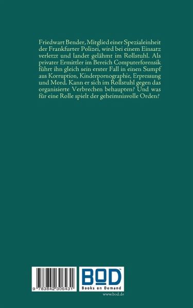 Friedwart Bender, Mitglied einer Spezialeinheit der Frankfurter Polizei, wird bei einem Einsatz so schwer verletzt, dass er gelähmt im Rollstuhl landet. Als privater Ermittler im Bereich Computerforensik hofft er, dass sein Leben etwas ruhiger wird. Doch gleich sein erster Fall wirft ihn in einen Sumpf aus Kinderpornografie, Korruption, Entführung und Mord. Hat er als Rollstuhlfahrer überhaupt eine Chance gegen das organisierte Verbrechen? Und was für eine Rolle spielt der geheimnisvolle Orden?Ein Privatermittler im Rollstuhl - skurril, abgedreht und voller Überraschungen.Man weiß nie, was hinter der nächten Ecke wartet.…mehr