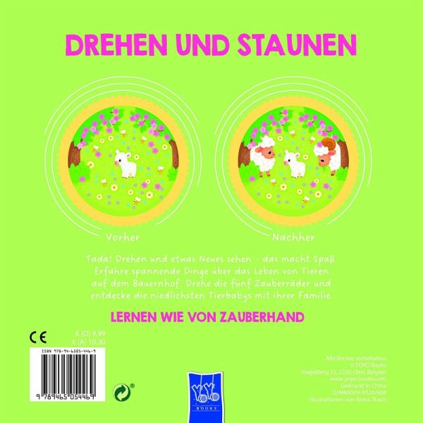 Interaktives Buch mit 5 magischen DrehscheibenDrehen und etwas Neues Sehen - das macht viel Spaß! Kinder erfahren spannende Dinge über Bauernhoftiere und ihren Lebensraum. Wenn sie an einer der fünf Drehscheiben drehen, wird aus dem einzelnen kleinen Tier eine niedliche Tierfamilie. Dieses liebevoll illustrierte Buch ist eine wundervolle Einführung für Kleinkinder in die Tierwelt. Das Drehen an den Rädern fördert gleichzeitig die Motorik und das genaue Hinsehen.