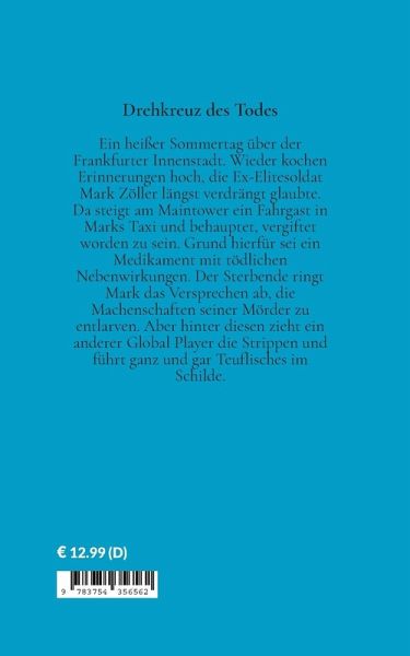 Drehkreuz des Todes (Thriller)Ein heißer Sommertag über der Frankfurter Innenstadt. Wieder kochen Erinnerungen hoch, die Ex-Elitesoldat Mark Zöller längst verdrängt glaubte. Da steigt am Maintower ein Fahrgast in Marks Taxi und behauptet, vergiftet worden zu sein. Grund hierfür sei ein Medikament mit tödlichen Nebenwirkungen. Der Sterbende ringt Mark das Versprechen ab, die Machenschaften seiner Mörder zu entlarven. Aber hinter diesen zieht ein anderer Global Player die Strippen und führt ganz und gar Teuflisches im Schilde.