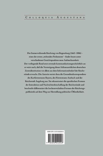 Politik und Diplomatie werden daher in diesem Buch innovativ aus dem Blickwinkel von Kommunikation und Information betrachtet, es ist also bewusst kein Beitrag zur Ereignisgeschichte des Immerwährenden Reichstags. Grundlage der Untersuchung bildet die reiche Überlieferung an Reichstagsberichten des Kurfürstentums Bayern, des Fürstentums Ansbach und der Reichsstadt Augsburg. Ergänzend wird ein breites Spektrum an Medien wie Reichstagskorrespondenzen, geschriebenen Zeitungen, Flugschriften, Amtsdruckschriften, Zeitungen, Zeitschriften, Messrelationen, Akteneditionen und Chroniken herangezogen und untersucht. Zeitlich ist die Untersuchung um 1700 angesiedelt: zwischen dem "Regensburger Stillstand" 1683/84 und der vorübergehenden Verlegung des Reichstags nach Augsburg 1713 – ein Zeitraum, der aus kommunikations- und medienhistorischer Perspektive besonders interessant ist.