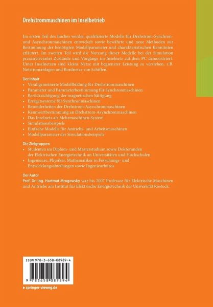 Im ersten Teil des Buches werden qualifizierte Modelle für Drehstrom-Synchron- und Asynchronmaschinen entwickelt sowie bewährte und neue Methoden zur Bestimmung der benötigten Modellparameter und charakteristischen Kennlinien erläutert. Im zweiten Teil wird die Nutzung dieser Modelle bei der Simulation praxisrelevanter Zustände und Vorgänge im Inselnetz auf dem PC demonstriert. Unter Inselnetzen sind kleine Netze mit begrenzter Leistung zu verstehen, z.B. Notstromanlagen und Bordnetze von Schiffen.