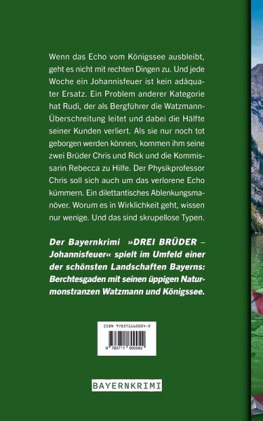 Wenn das Echo vom Königssee ausbleibt, geht es nicht mit rechten Dingen zu. Und jede Woche ein Johannisfeuer ist kein adäquater Ersatz. Ein Problem anderer Kategorie hat Rudi, der als Bergführer die Watzmann-Überschreitung leitet und dabei die Hälfte seiner Kunden verliert. Als sie nur noch tot geborgen werden können, kommen ihm seine zwei Brüder Chris und Rick und die Kommissarin Rebecca zu Hilfe. Der Physikprofessor Chris soll sich auch um das verlorene Echo kümmern. Ein dilettantisches Ablenkungsmanöver. Worum es in Wirklichkeit geht, wissen nur wenige. Und das sind skrupellose Typen. Der Bayernkrimi »DREI BRÜDER - Johannisfeuer« spielt im Umfeld einer der schönsten Landschaften Bayerns: Berchtesgaden mit seinen üppigen Naturmonstranzen Watzmann und Königssee.