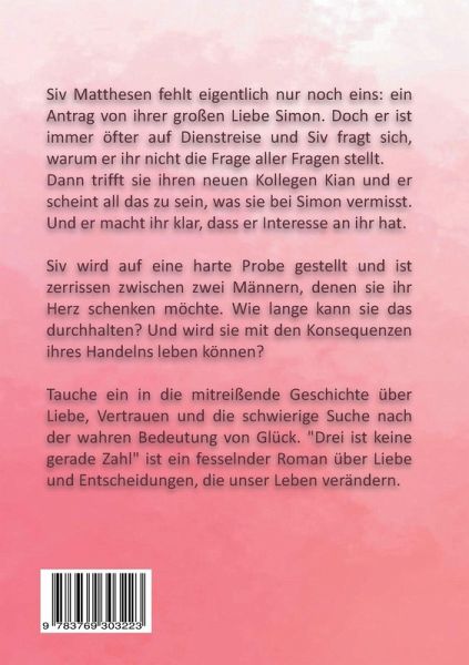Siv Matthesen fehlt eigentlich nur noch eins: ein Antrag von ihrer großen Liebe Simon. Doch er ist immer öfter auf Dienstreise und Siv fragt sich, warum er ihr nicht die Frage aller Fragen stellt. Dann trifft sie ihren neuen Kollegen Kian und er scheint all das zu sein, was sie bei Simon vermisst. Und er macht ihr klar, dass er Interesse an ihr hat. Siv wird auf eine harte Probe gestellt und ist zerrissen zwischen zwei Männern, denen sie ihr Herz schenken möchte. Wie lange kann sie das durchhalten? Und wird sie mit den Konsequenzen ihres Handelns leben können? Tauche ein in die mitreißende Geschichte über Liebe, Vertrauen und die schwierige Suche nach der wahren Bedeutung von Glück. "Drei ist keine gerade Zahl" ist ein fesselnder Roman über Liebe und Entscheidungen, die unser Leben verändern.