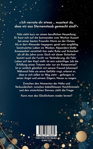 Felix steht kurz vor einem beruflichen Neuanfang. Er freut sich auf die kommenden zwei Wochen Auszeit bei seiner besten Freundin Marie an der Ostsee. Als er dort Alexander begegnet, gerät sein sorgfältig konstruiertes Leben ins Wanken. Alexanders bloße Anwesenheit vermittelt ihm mehr Ruhe und Sicherheit als all die Jahre zuvor. Doch mit dieser Sicherheit kommt auch die Furcht vor Veränderung, die Felix' Leben auf den Kopf stellt. Ist sein zukünftiger Job die Erfüllung seiner Träume oder nur ein Kompromiss? Ist er wirklich glücklich mit seinem Freund Johannes? Während Felix um seine Gefühle ringt, erkennt er, dass er sich selbst im Weg steht - gefangen in seiner Angst und seinem Zögern, Neues zu wagen. Zwischen den Momenten der Nähe und Verbundenheit, zwischen kobaltblauem Nachthimmel und den winterlichen Sternen, steht die Frage: Kann man das Glücklichsein wieder lernen?