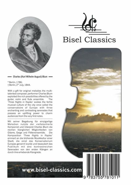 With a gift for original melodies the multitalented composer, performer Charles Blum exploited the rich possibilities offered by the guitar, violin and flute ensemble. The 'Three Nights in Naples' evokes the fertile musical culture of the city once called the conservatoire of Europe with three enchanting and contrasting serenades that possess an uplifting power to charm audiences from the very first notes.---Mit seiner Begabung für einzigartige Melodien nutzte der vieltalentierte Komponist und Interpret Charles Blum die reichen klanglichen Möglichkeiten von Gitarre, Geige und Flötenensemble. Die Komposition Three Nights in Naples' erinnert an die blühende Musikkultur einer Stadt, die einst das Konservatorium Europas genannt wurde und bezaubert das Publikum mit drei kontrastreichen Serenaden von den ersten Klängen an durch ihre erhebende Klangrede.