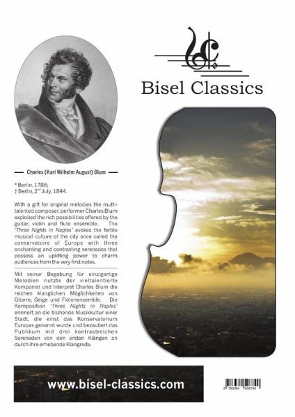 Mit seiner Begabung für einzigartige Melodien nutzte der vieltalentierte Komponist und Interpret Charles Blum die reichen klanglichen Möglichkeiten von Gitarre, Geige und Flötenensemble. Die Komposition erinnert an die blühende Musikkultur einer Stadt, die einst das Konservatorium Europas genannt wurde und bezaubert das Publikum mit drei kontrastreichen Serenaden von den ersten Klängen an durch ihre erhebende Klangrede.----With a gift for original melodies the multi-talented composer, performer Charles Blum exploited the rich possibilities offered by the guitar, violin, and flute ensemble. The [composition] evokes the fertile musical culture of the city once called the conservatoire of Europe with three enchanting and contrasting serenades that possess an uplifting power to charm audiences from the very first notes.