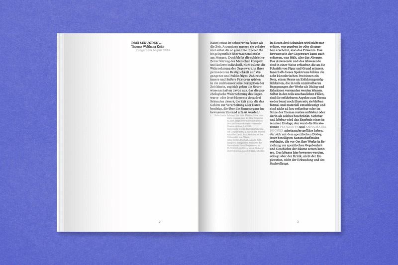 Alles, was wir Welt nennen, alles, was wir greifen, spüren, denken - es lebt in einem schmalen Spalt von Zeit: drei Sekunden lang. Dann fliegt der Augenblick davon, verliert seine Schärfe, wird Erinnerung, wird Abwesenheit.Was wir als "Jetzt" empfinden, ist nichts Stabiles. Neurowissenschaften haben ergeben, dass unsere bewusste Gegenwart in drei Sekunden langen Inseln des Erlebens stattfindet. Danach bricht ein neuer Zeitstrom an, ein neues "Jetzt", welches das vorherige verschluckt. In diesen Sekundenfenstern speichert unser Gehirn den Klang einer Melodie, die Geste eines Anderen, die Bewegung des eigenen Körpers. Ist der Reiz vorbei, beginnt das Sortieren - und das Vergessen.Die Künstler:innen dieser Ausstellung begeben sich in genau diesen Spalt: in die Zeit zwischen dem, was war, und dem, was schon nicht mehr ist. Ihre Arbeiten greifen das Absente auf, zelebrieren das ephemere Dazwischen - dort, wo ein Bild zerfällt, eine Form flüchtet, ein Gedanke sich auflöst.Drei Sekunden ist ein Versuch, das Absente sichtbar zu machen. Die Ausstellung erschafft Räume für das Flüchtige, öffnet Resonanzräume für das Jetzt, das uns entgleitet, kaum dass wir es berühren. Hier wird Absenz nicht als Verlust begriffen, sondern als die notwendige Bedingung für das Empfinden von Gegenwart. Denn: Nur was vergeht, kann auch gegenwärtig gewesen sein.