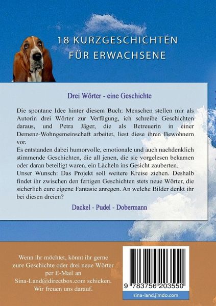 18 Kurzgeschichten für ErwachseneDrei Wörter - eine GeschichteDie spontane Idee hinter diesem Buch: Menschen stellen mir als Autorin drei Wörter zur Verfügung, ich schreibe Geschichten daraus, und Petra Jäger, die als Betreuerin in einer Demenz-Wohngemeinschaft arbeitet, liest diese ihren Bewohnern vor.Es entstanden dabei humorvolle, emotionale und auch nachdenklich stimmende Geschichten, die all jenen, die sie vorgelesen bekamen oder daran beteiligt waren, ein Lächeln ins Gesicht zauberten.Unser Wunsch: Das Projekt soll weitere Kreise ziehen. Deshalb findet ihr zwischen den fertigen Geschichten stets neue Wörter, die sicherlich eure eigene Fantasie anregen. An welche Bilder denkt ihr bei diesen dreien? Dackel - Pudel - DobermannWenn ihr möchtet, könnt ihr gerne eure Geschichte oder drei neue Wörter per E-Mail an Sina-Land@directbox.com schicken. Wir freuen uns darauf.