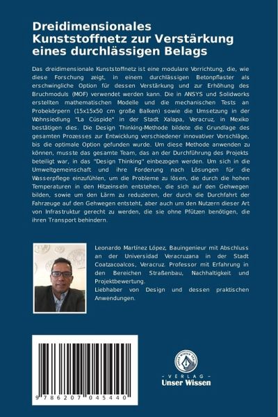 Das dreidimensionale Kunststoffnetz ist eine modulare Vorrichtung, die, wie diese Forschung zeigt, in einem durchlässigen Betonpflaster als erschwingliche Option für dessen Verstärkung und zur Erhöhung des Bruchmoduls (MOF) verwendet werden kann. Die in ANSYS und Solidworks erstellten mathematischen Modelle und die mechanischen Tests an Probekörpern (15x15x50 cm große Balken) sowie die Umsetzung in der Wohnsiedlung "La Cúspide" in der Stadt Xalapa, Veracruz, in Mexiko bestätigen dies. Die Design Thinking-Methode bildete die Grundlage des gesamten Prozesses zur Entwicklung verschiedener innovativer Vorschläge, bis die optimale Option gefunden wurde. Um diese Methode anwenden zu können, musste das gesamte Team, das an der Durchführung des Projekts beteiligt war, in das "Design Thinking" einbezogen werden. Um sich in die Umweltgemeinschaft und ihre Forderung nach Lösungen für die Wasserpflege einzufühlen, um die Probleme zu lösen, die durch die hohen Temperaturen in den Hitzeinseln entstehen, die sich auf den Gehwegen bilden, sowie um den Lärm zu reduzieren, der durch die Durchfahrt der Fahrzeuge auf den Gehwegen entsteht, aber auch um den Nutzern dieser Art von Infrastruktur gerecht zu werden, die sie ohne Pfützen benötigen, die ihren Transport behindern.