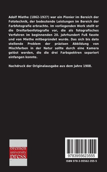 Adolf Miethe (1862-1927) war ein Pionier im Bereich der Fototechnik, der bedeutende Leistungen im Bereich der Farbfotografie erbrachte. Im vorliegenden Werk stellt er die Dreifarbenfotografie vor, die als fotografisches Verfahren im beginnenden 20. Jahrhundert Fuß fasste und von Miethe mitbegründet wurde. Das sich bis dato stellende Problem der präzisen Abbildung von Mischfarben in der Natur sollte durch eine Kamera gelöst werden, die die drei Farbspektren separiert einfangen konnte.